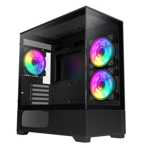 - Three Infinity 120mm ARGB Dual-Ring Black Fans Bundled – This version of the GameMax Vista comes bundled with 3 x Infinity 120mm ARGB Dual-Ring Black Fans – Perfect for great cooling when planning to use an AIO Cooler, as this virtually maximises your cooling setup. With the Dual-Ring and the circular-shaped, multi-layer Infinity Mirror Design, the Infinity fans add a mesmerising LED lighting display to the Vista. Please note the fans are included inside the box only and will need to be installed.